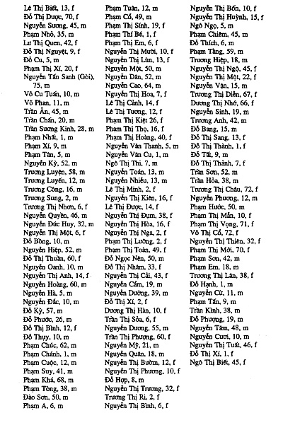 The names of the deceased are followed by their age and sex. A brief tally shows that 50 of the people were three years old or younger, 69 were between the ages of four and seven, 91 were between eight and twelve, and 27 were in their seventies or eighties. The list was provided by the Embassy of Vietnam in Washington, D.C., in response to a request by Trent Angers, author of The Forgotten Hero of My Lai: The Hugh Thompson Story.